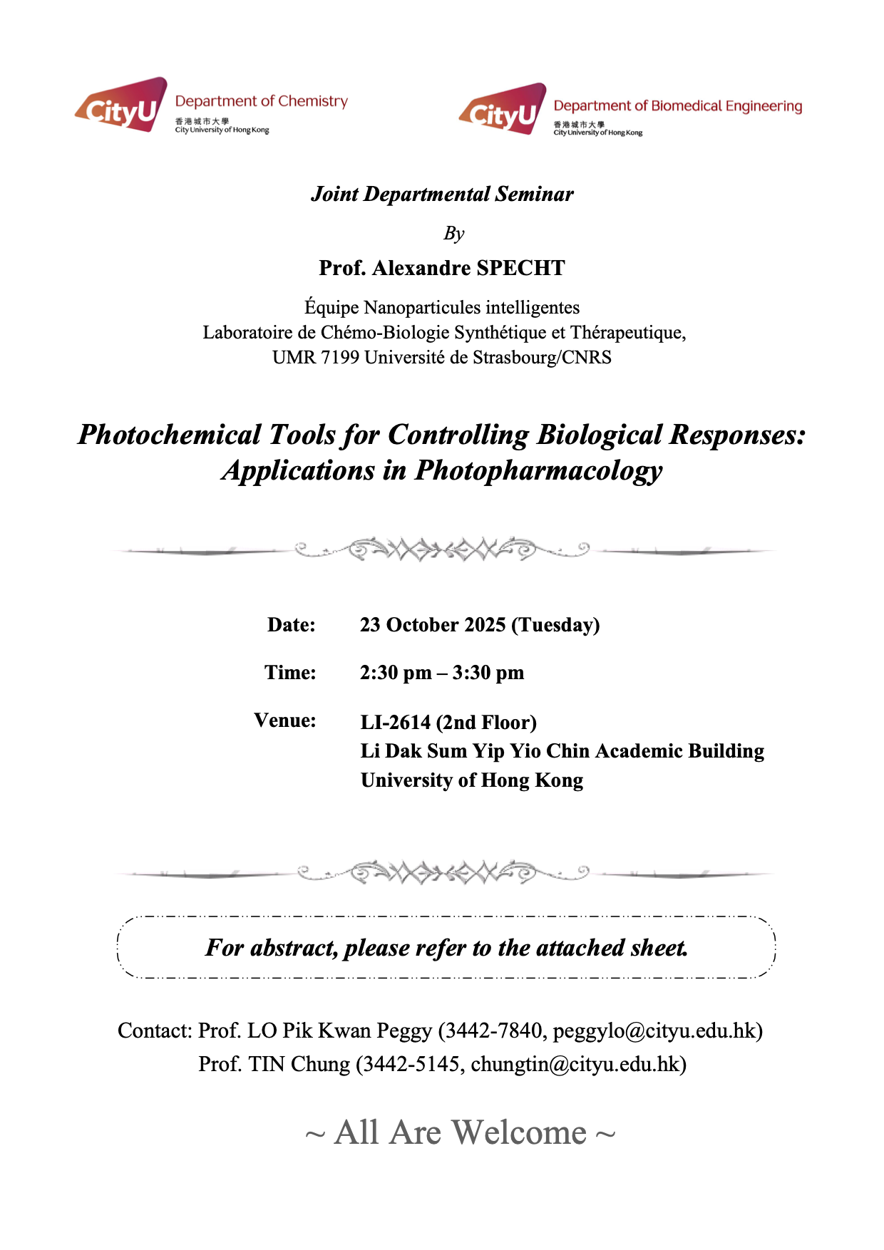 Alexandre Specht donnera une conférence intitulée "Photochemical Tools for Controlling Biological Responses: Applications in Photopharmacology", au département de chimie de la city U University de HONG-Kong, (Chine).