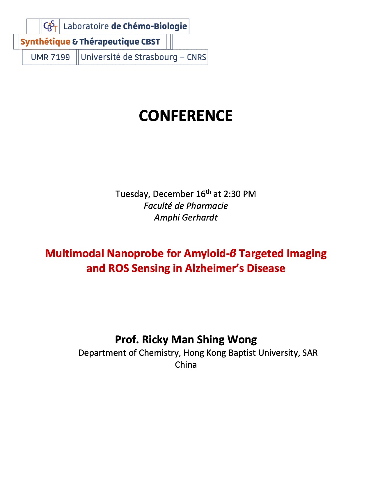 Prof. Ricky Man Shing Wong (Department of Chemistry, Hong Kong Baptist University, SAR China) will give a lecture entitled “Multimodal Nanoprobe for Amyloid-β Targeted Imaging and ROS Sensing in Alzheimer’s Disease”.