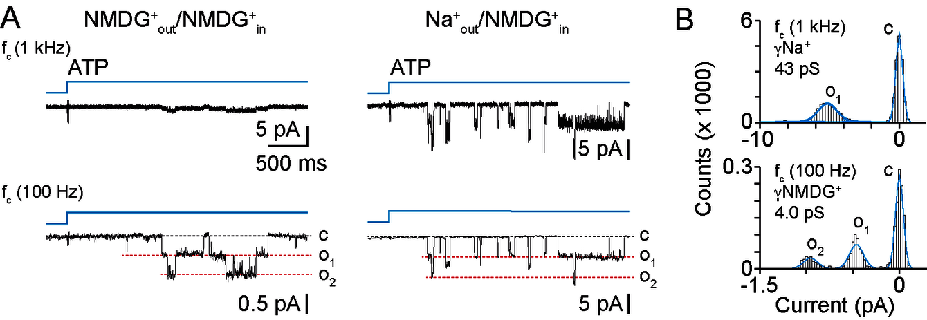 Our recent work on ATP-gated P2X receptors has contributed to understanding the molecular mechanisms of permeation of large cations, such as the synthetic molecule N-methyl-D-glucamine (NMDG+), through the pore. By combining single-channel recordings and the use of optotweezers, we show that NMDG+ permeation occurs in an open state similar to that permeable to Na+ ions. This open state has a sufficiently large opening to allow the passage of NMDG+ ions, but the rates at which these large cations percolate the pore are roughly 10 times slower than those of Na+ ions (Harkat et al., PNAS 2017). These findings partially explain the mechanism of macropore formation, which remains a unique feature of P2X receptors.